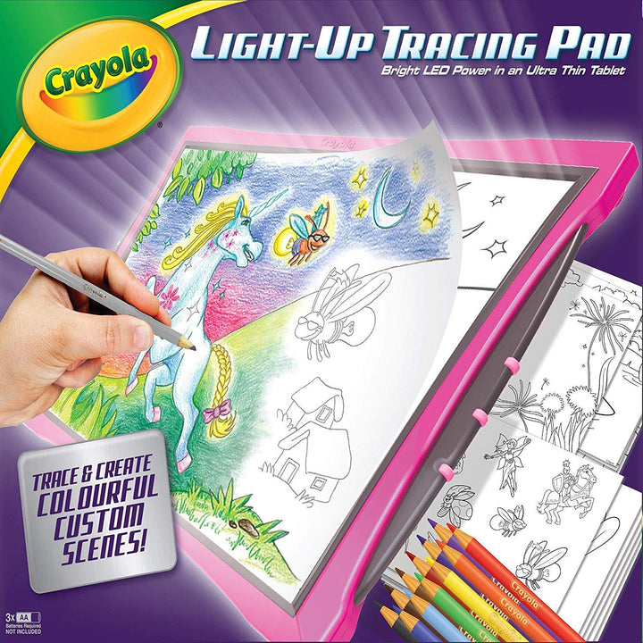 The Crayola Light Up Tracing Pad lets kids trace and colour detailed scenes. The ultra-thin tablet design and bright LED drawing surface make tracing easy. Start tracing right away with the content inside, then download 100s of images online. Includes 1 tracing pad, 12 coloured pencils, 1 tracing pencil, 6 content sheets and 10 blank sheets. One supplied.
