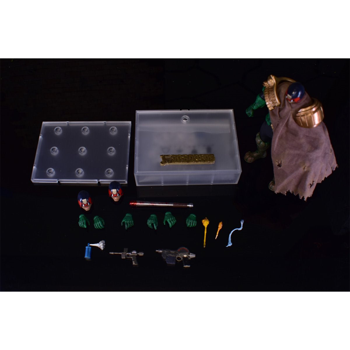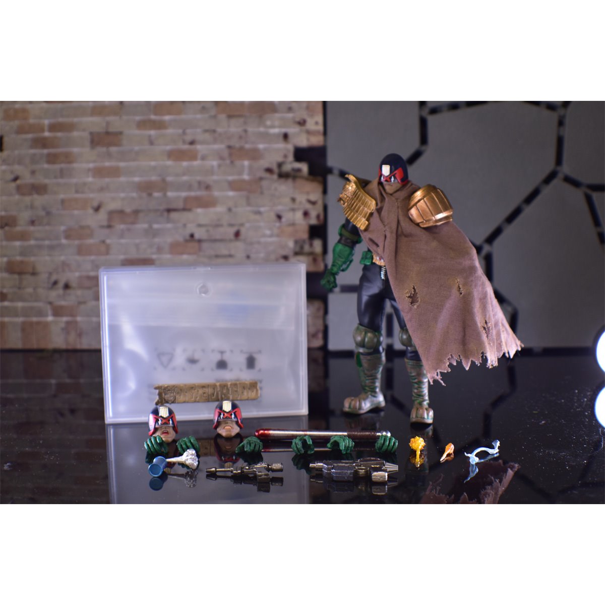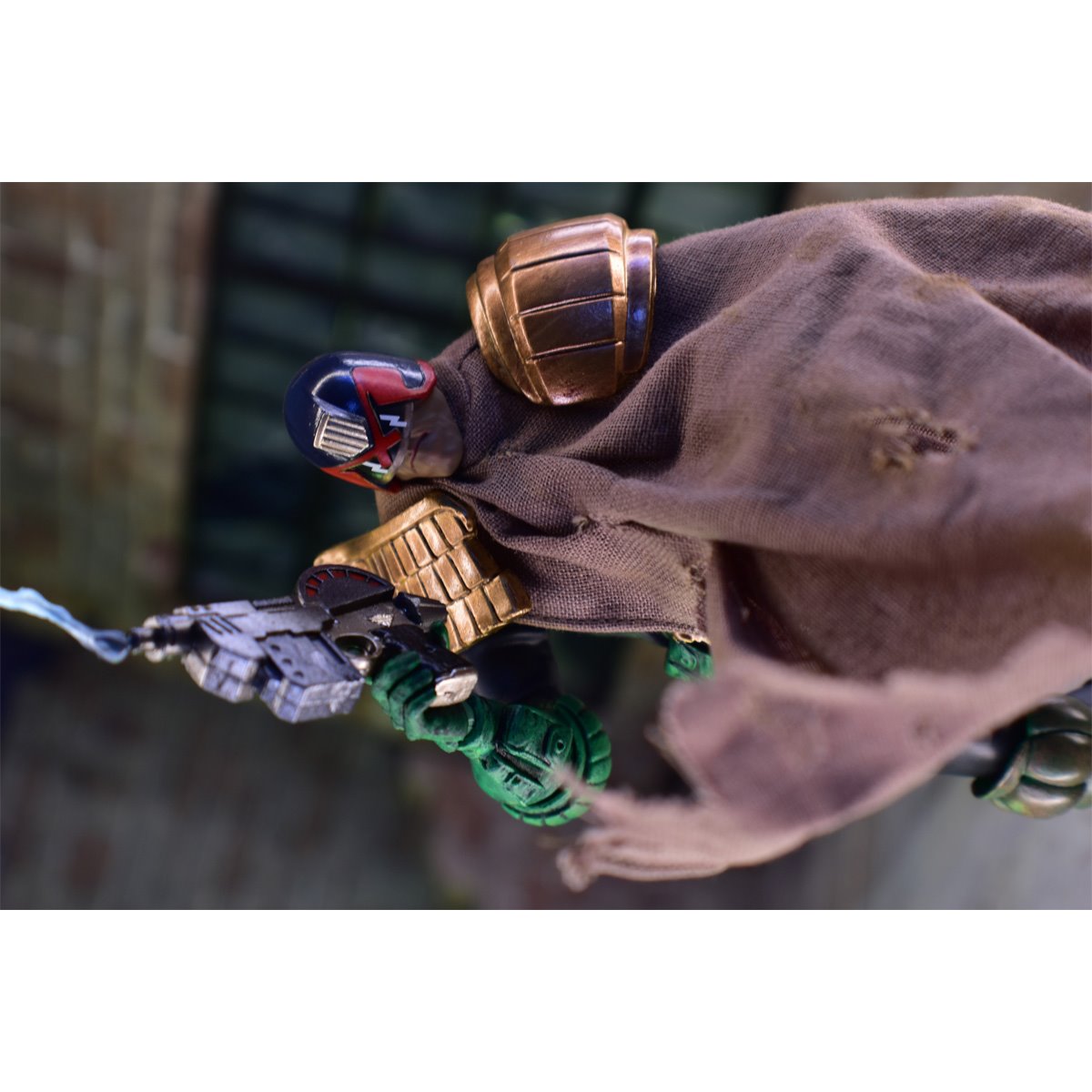 Infinity Collectables x Previews Exclusive! Dredd is ready for the harshest conditions on Earth! Rebellion and Hiya Toys are proud to unveil the Judge Dredd Cursed Earth Exquisite Super Series 1:12 Scale Action Figure - SDCC 2024 Previews Exclusive! Dressed in his fabric "rad-cloak" to protect him from the radiation and harsh weather of the Cursed Earth, Dredd is ready to head out from the safety of Mega-City One's walls and into the blasted landscape of America, where everything from dinosaurs to flying sharks lurks. Only the ultimate lawman of the future can hope to survive in this truly cursed land! This 6-inch tall figure features 18 points of articulation. He includes both versions of the classic Lawgiver sidearm, as well as gun flame effects, nightstick, replacement hands, alternate faces, Boing spray, and a display base. Judge Dredd is limited to 1,000 pieces!