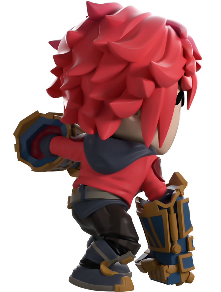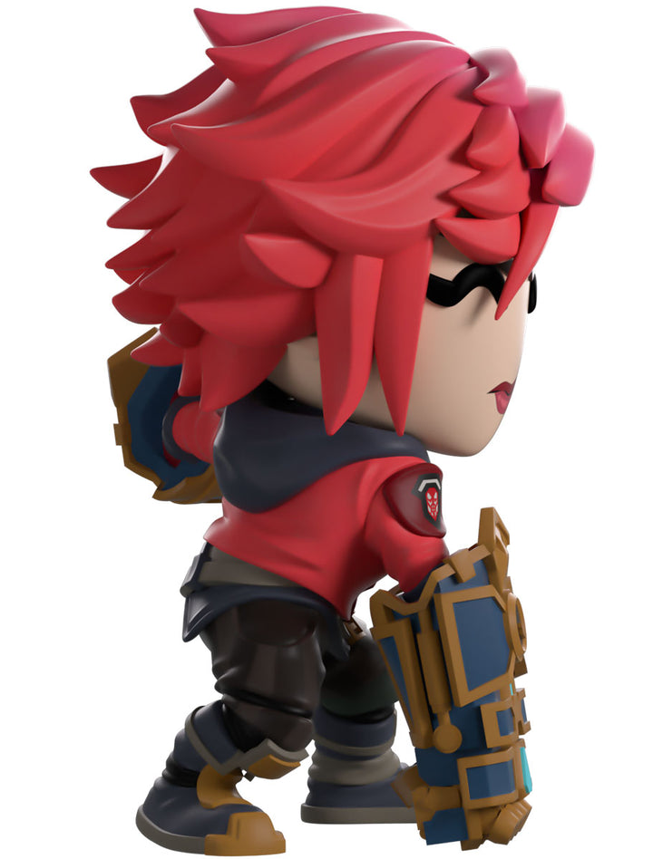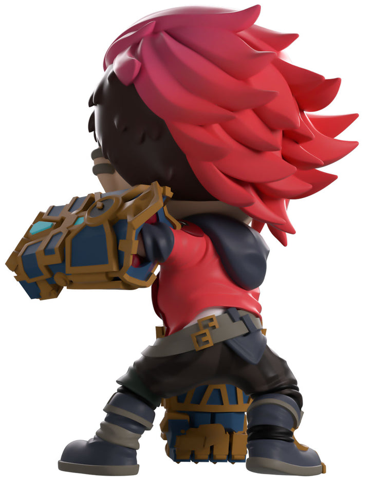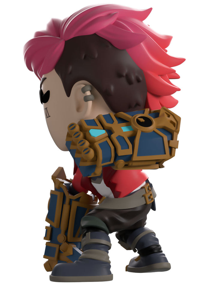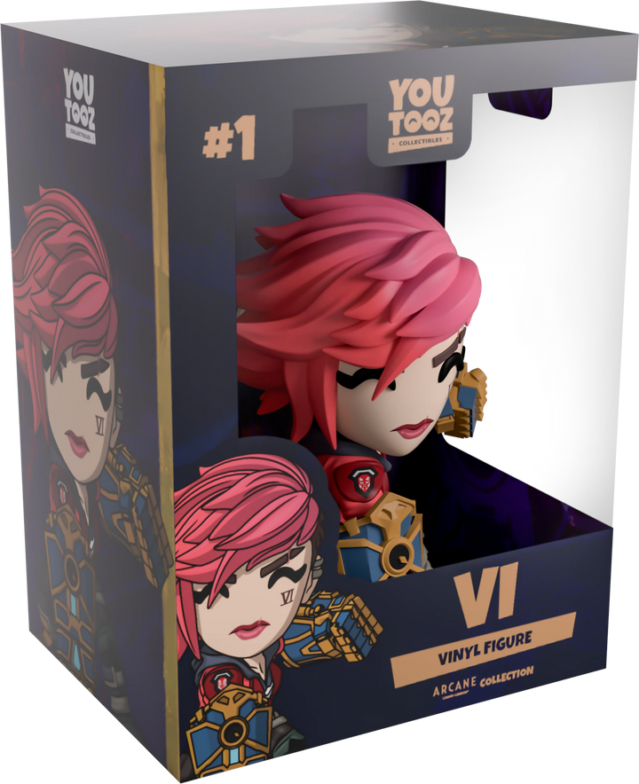 Vi’s trekked her way into Youtooz in hopes of reuniting with her family with a Youtooz debut! At 3.8 inches tall and posed slamming a hefty gold and blue Hextech gauntlet into the ground as she raises the other behind her, ready to unleash a catastrophic final blow, scars cut through her eyebrow and pink lips as a ‘VI’ is tattooed on her upper cheek. With the side of her head shaved down to short brown locks as the rest of her long pink hair sweeps to the side, she wears an open red jacket over a blue hoodie, dark striped pants and tall brown boots as a pair of belts wrap around her waist. The exterior of her dark blue packaging is covered in deep red and gold streaks running down its front. These then work their way onto the smudged red and blue interior, while the protective sleeve is a dark blue with a simple golden frame as her figure can be seen through the large clear window at the packaging’s front. This collectible ships in a matte, embossed, protective outer sleeve and a custom-sized plastic protector for maximum protection during shipping.