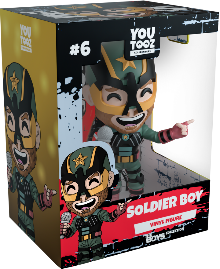 Soldier Boy hits the stage to debut his arrival at Youtooz, no it’s not cheesy! Look how classy he is! Busting out some sweet tunes to show just how much of an icon he is and standing at 4.7 inches tall with a silver microphone held in one hand, the other points a finger outwards friskily. Wearing a green, gold and black mask that covers the top of his face and resembles an eagle and a yellow star on the forehead, he wears a green costume with a back chestplate and bands around his legs along with maroon gloves and shin guards. The exterior of his packaging shows Soldier Boy standing on a dazzling golden stage with a microphone held to his mouth. The interior surrounds him in a graffiti scrawled white brick wall that continues onto the protective sleeve with blood stains, as his figure can be seen through the large clear window at the packaging’s front. This collectible ships in a matte, embossed, protective outer sleeve and a custom sized plastic protector for maximum protection during shipping.