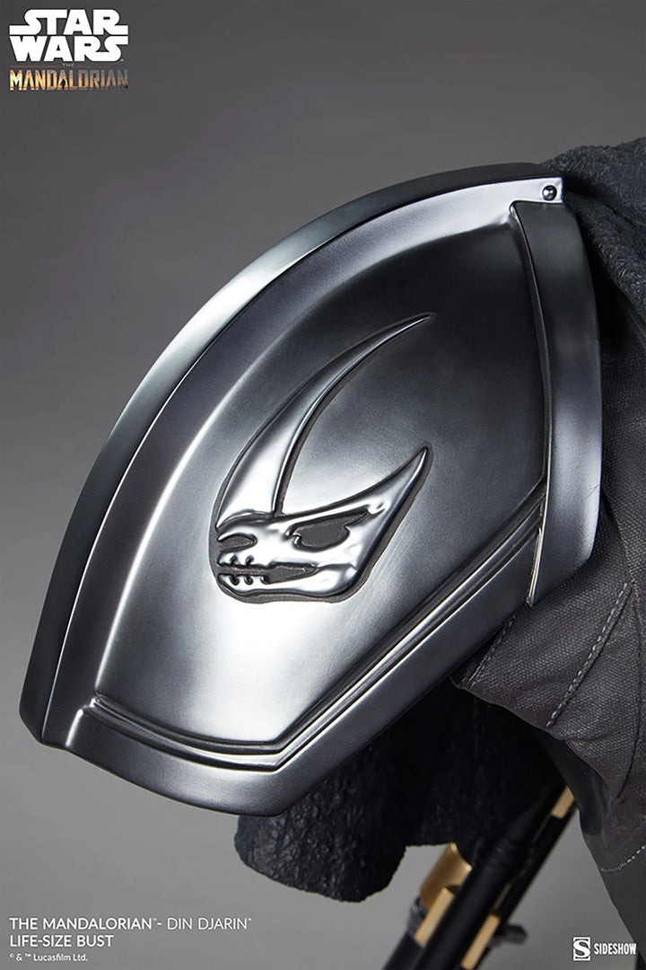 The Mandalorian – Din Djarin Life-Size Bust measures 33.5” tall and 27” wide as he remains vigilant searching for his next target. With rotational articulation in the helmet, collectors can directionally change his focus for added storytelling in any display. His sleek silver armor and costume elements are fully sculpted, recreating his now-iconic silhouette in fiberglass design. Din Djarin's chest armor, helmet, bandolier, and even cape bear details of weathering and distress accumulated in his dangerous travels. Finally, his right shoulder pauldron features the unique mudhorn™ signet bestowed upon him by the Armorer. For those who walk the Way of the Mandalore™, this is a must-have centerpiece in any galactic display.
