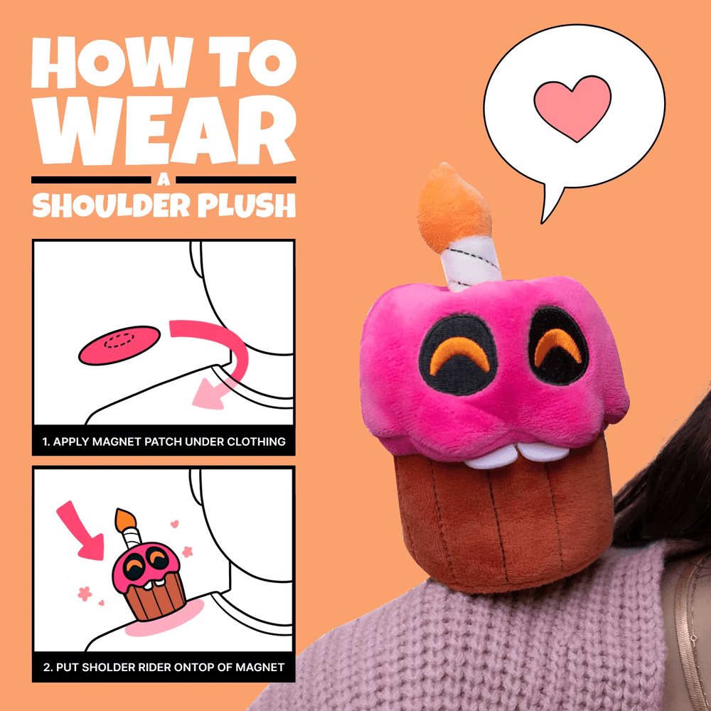 The Cupcake Shoulder Rider lands at Youtooz to make you the most stylish chica around! Plopped down at 6 inches tall it stares at you with its piercing eyes that glow a bright orange from their dark housing and perfectly contrast their frosted pink head! Topped with a single candle that stands tall and burns brightly, their buck teeth happily poke over a stripped brown casing. Each plushie is a minky material packed to the seams with the most huggable squishy 100% PP cotton and comes equipped with a magnetic disc to let it perch firmly atop your shoulder as the best accessory and a true testament to your love of the fandom!