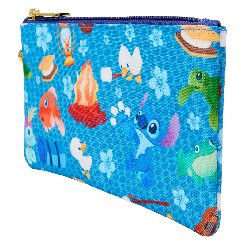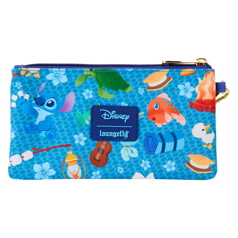 The Loungefly Stitch Camping Cuties AOP Nylon Wristlet features shiny gold hardware, detachable wrist strap, and printed details. Inside features three slots for holding cards and important items. Take note of the coordinating inside lining.