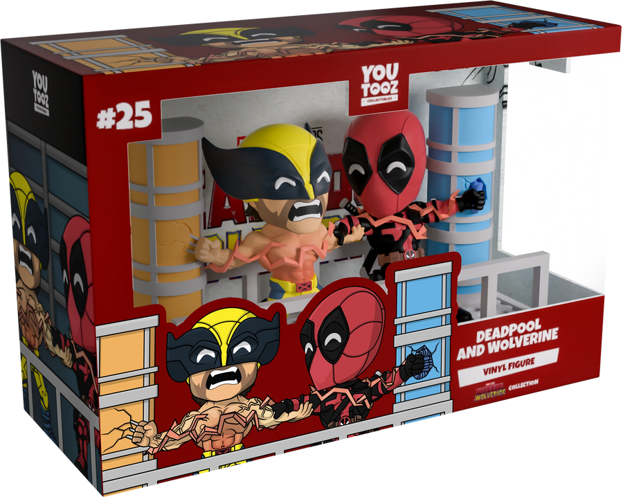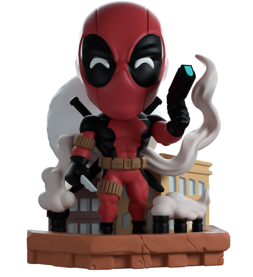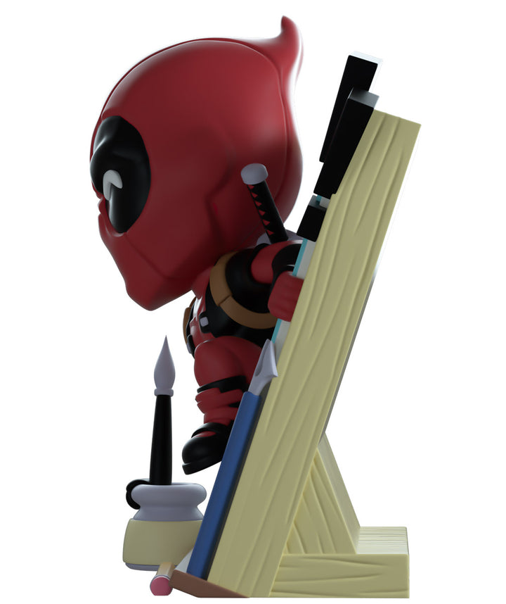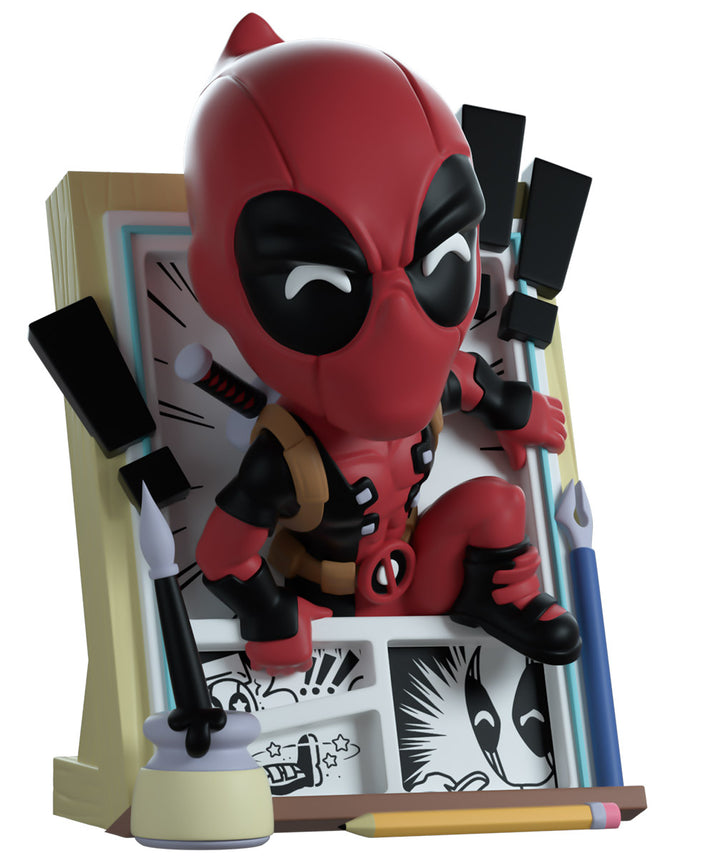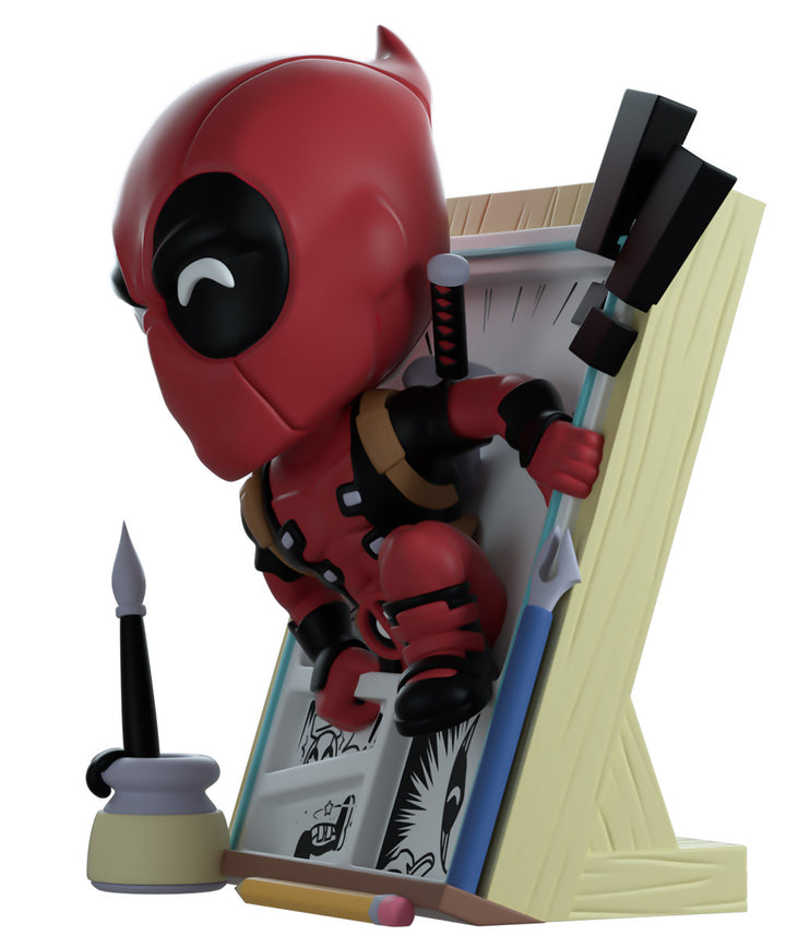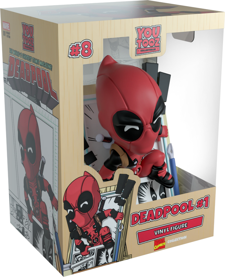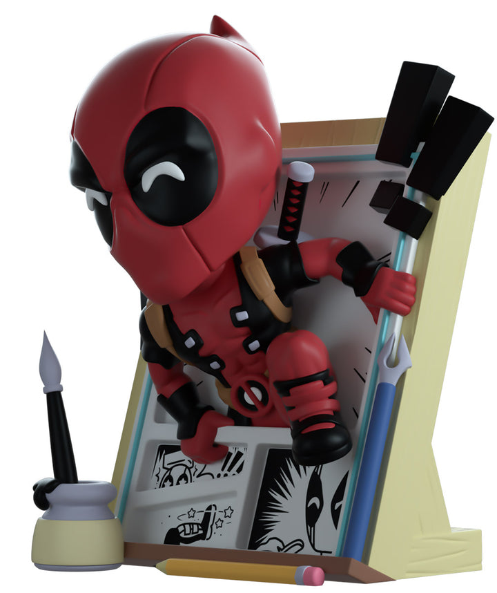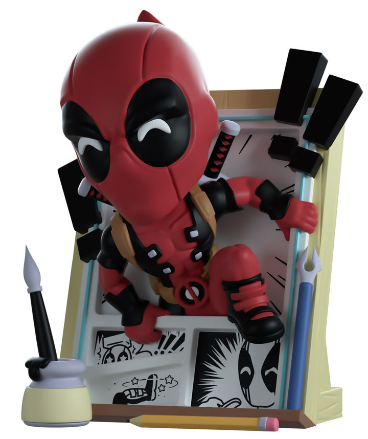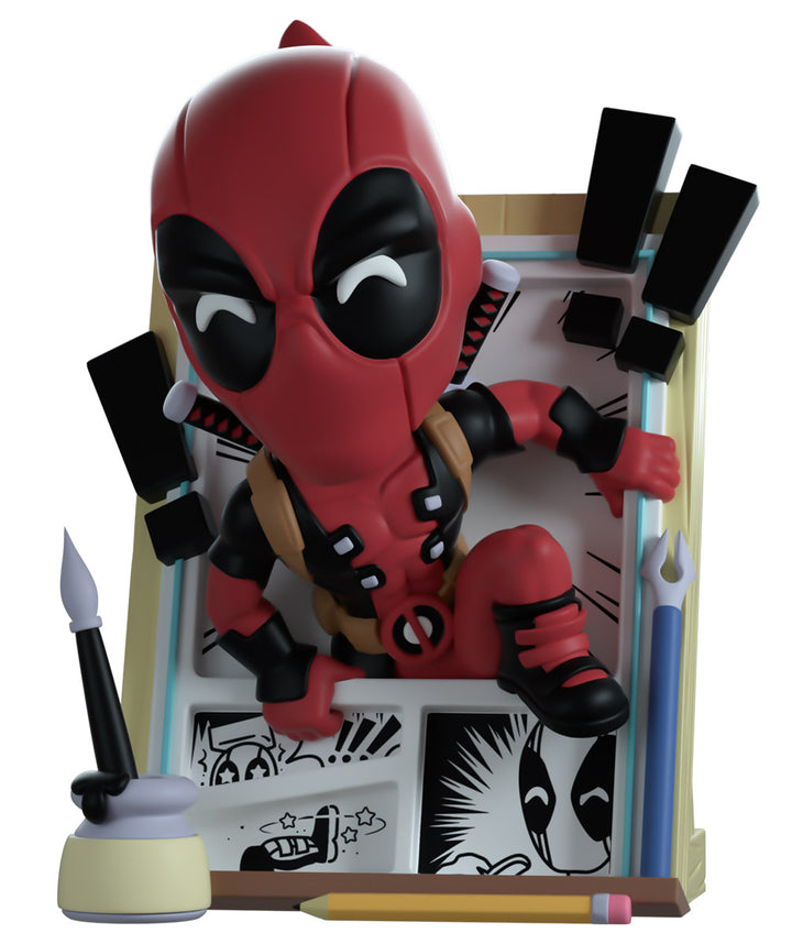 The Merc with a mouth has broken the 4th wall in true Deadpool fashion to make his Youtooz debut! Climbing out of the black and white panels of a comic page at 5.1 inches tall, his hands clasp the edges of the story he’s escaping as his left foot prepares to launch him forward and straight into the real world past a flurry of exclamation marks and drawing tools. Wearing his usual red and black skin-tight suit, that is adorned with a brown belt and shoulder straps, dual katanas sit crossed on his back as bright white pupils shine through the frowning black eyes of his mask which raises in a curled point at the back. The exterior of his packaging sees Deadpool running down the outside of a skyscraper, while the interior is covered in the light grey panels of Marvel comics. The protective sleeve is then covered in a light brown wood grain pattern as his figure can be seen through the large clear window at the packaging’s front. This collectible ships in a matte, embossed, protective outer sleeve and a custom-sized plastic protector for maximum protection during shipping.
