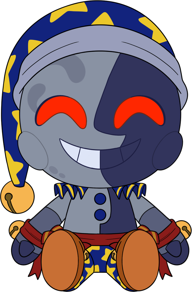 At 6 inches tall and sitting with their short legs kicked forward, a cheeky smile crosses up their two toned grey and blue face as shining red eyes peer out underneath a long slouching star patterned blue hat that’s tipped with a bell. Their frilled blue and yellow collar matches their flared pants, while a brown waist piece matches wrist bands and curled shoes which are adorned with golden bells. This plushie is made of a minky material packed to the seams with the most huggable squishy 100% PP cotton and comes equipped with a magnetic disc to let it perch firmly atop your shoulder as the best accessory and a true testament to your love of the fandom!