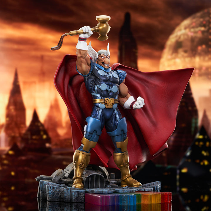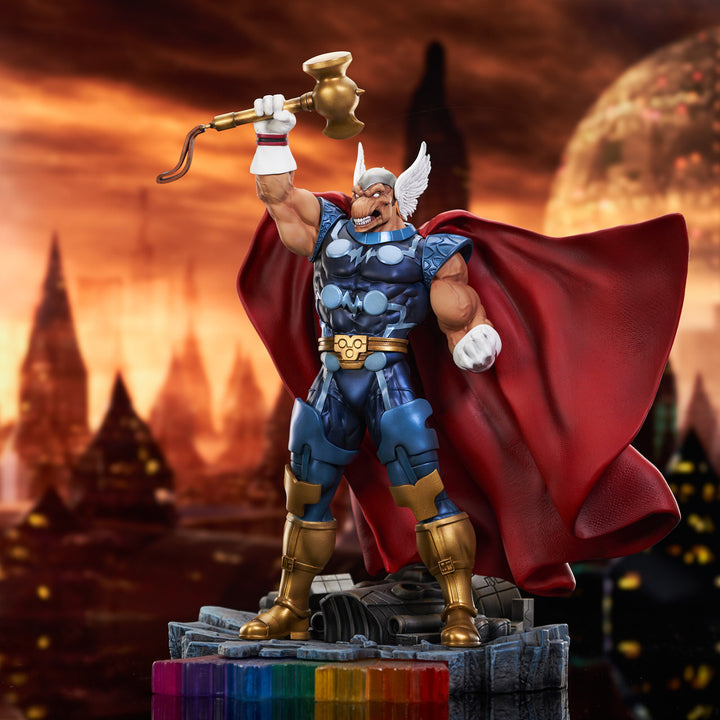 A Diamond Select Toys release! For Asgard! The alien warrior known as Beta Ray Bill has arrived, in his classic costume, as the newest Premier Collection statue from DST! This 1/7 scale statue stands approximately 12 inches tall and featured detailed sculpting and paint applications atop a sculpted base depicting the shattered ruins of the Rainbow Bridge, Bifrost. Limited to only 3000 pieces, it comes packaged with a numbered certificate of authenticity in a full-color box. Designed by Yuri Timg, sculpted by Alejandro Pereira Ezcurra!