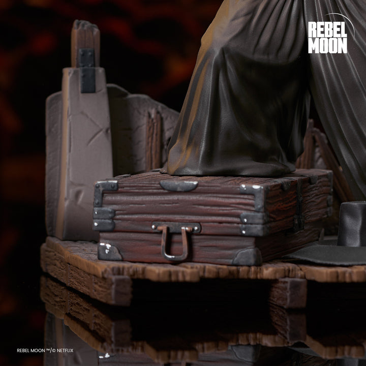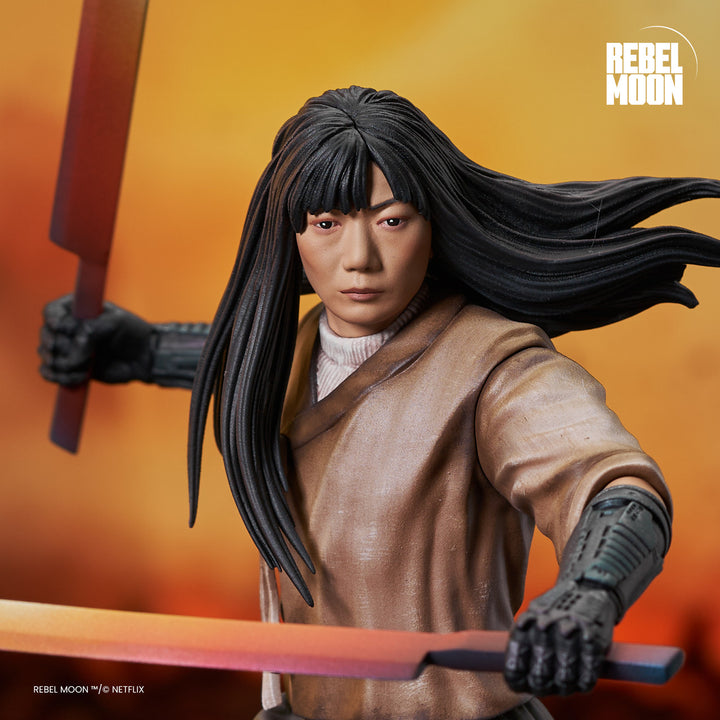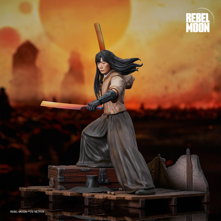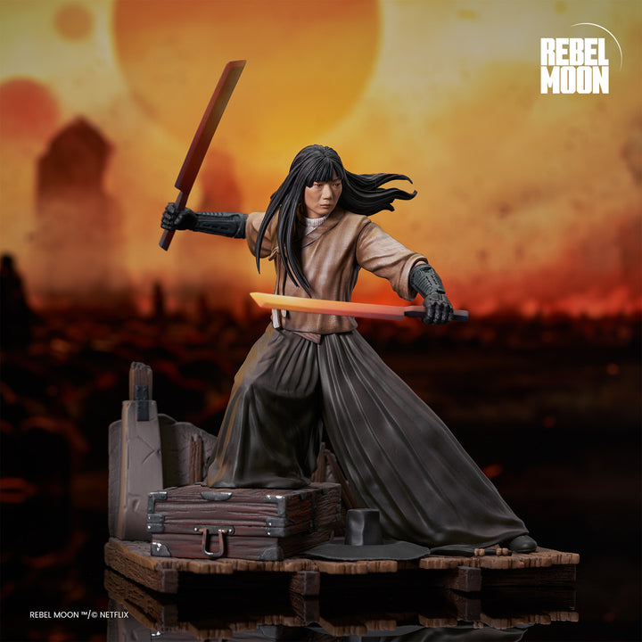 Rebel Moon is nearly here! The sci-fi epic from epic storyteller Zack Snyder is coming to Netflix very soon, and based on the visuals alone, it promises to be well worth the wait! One of the breakout characters is sure to be Nemesis, played by Doona Bae, and this Gallery Diorama captures her in action! With one foot up on a suitcase and her red-hot swords in her artificial hands, Nemesis stands approximately 9 inches tall and is made of high-quality PVC. This sculpture comes packaged in a full color window box.