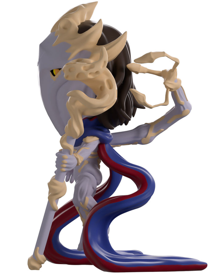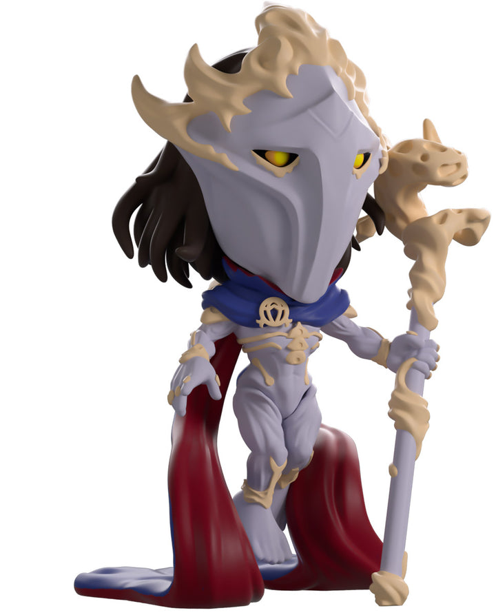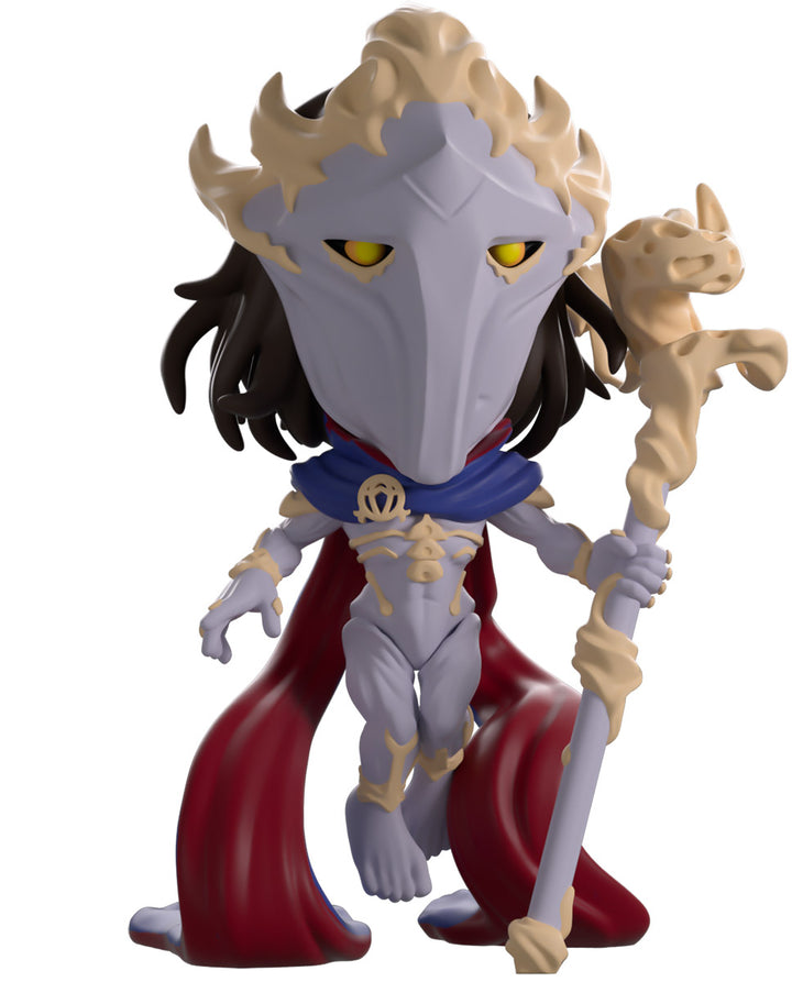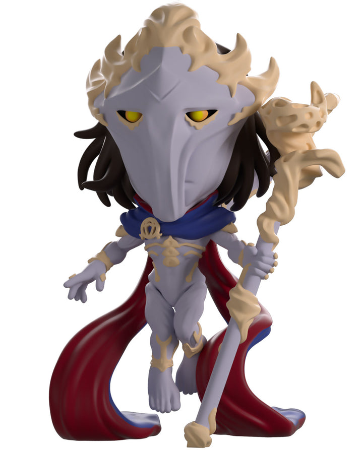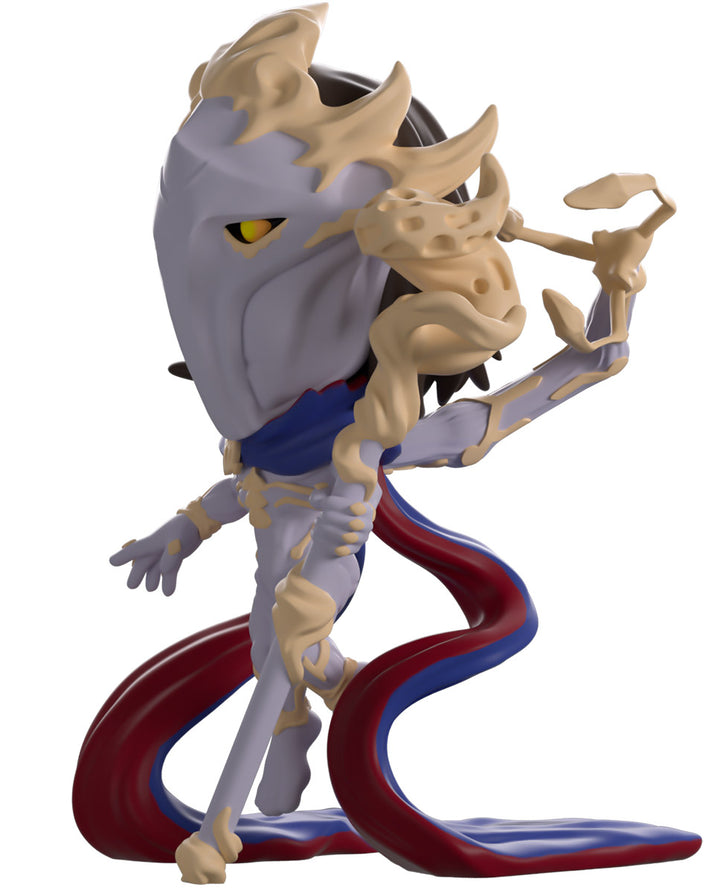 We’ve been developing something secret here at Youtooz recently and there’s only one brilliant mind we could ask to help us finish it! Floating at 5 inches tall with a blue and maroon cloak falling from his shoulder in two thick curling stands to rest on the ground, his yellow eyes stare through a solemn masked face which has bone-esque spikes emerging from its top. Gripping a staff with a spiralling end in his left hand, a long arm emerges from the back of his thin grey body to reach forward with a trio of armoured fingers. The exterior of his packaging is covered in pale bubbles which work their way onto the interior as bright red and blue strings stretch across them. The protective sleeve is then a dark blue with a simple golden frame as his figure can be seen through the large clear window at the packaging’s front. This collectible ships in a matte, embossed, protective outer sleeve and a custom-sized plastic protector for maximum protection during shipping.