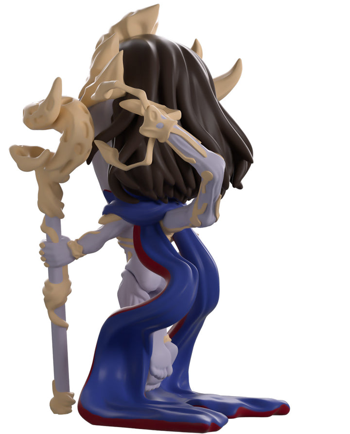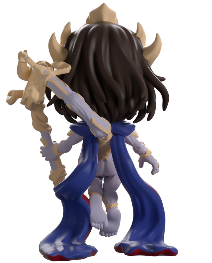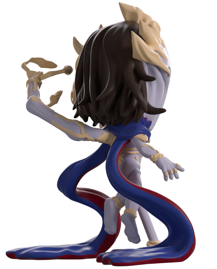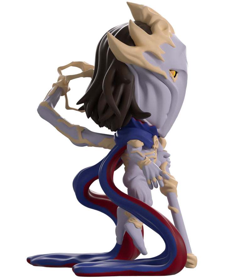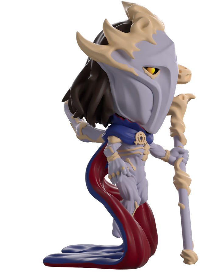 We’ve been developing something secret here at Youtooz recently and there’s only one brilliant mind we could ask to help us finish it! Floating at 5 inches tall with a blue and maroon cloak falling from his shoulder in two thick curling stands to rest on the ground, his yellow eyes stare through a solemn masked face which has bone-esque spikes emerging from its top. Gripping a staff with a spiralling end in his left hand, a long arm emerges from the back of his thin grey body to reach forward with a trio of armoured fingers. The exterior of his packaging is covered in pale bubbles which work their way onto the interior as bright red and blue strings stretch across them. The protective sleeve is then a dark blue with a simple golden frame as his figure can be seen through the large clear window at the packaging’s front. This collectible ships in a matte, embossed, protective outer sleeve and a custom-sized plastic protector for maximum protection during shipping.