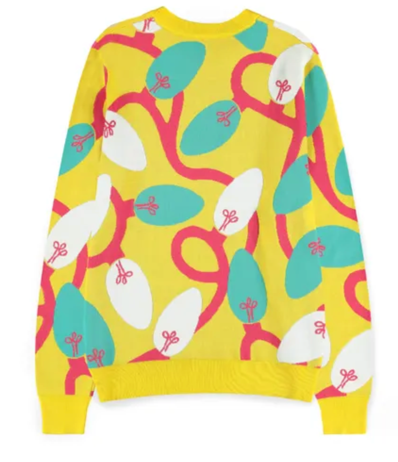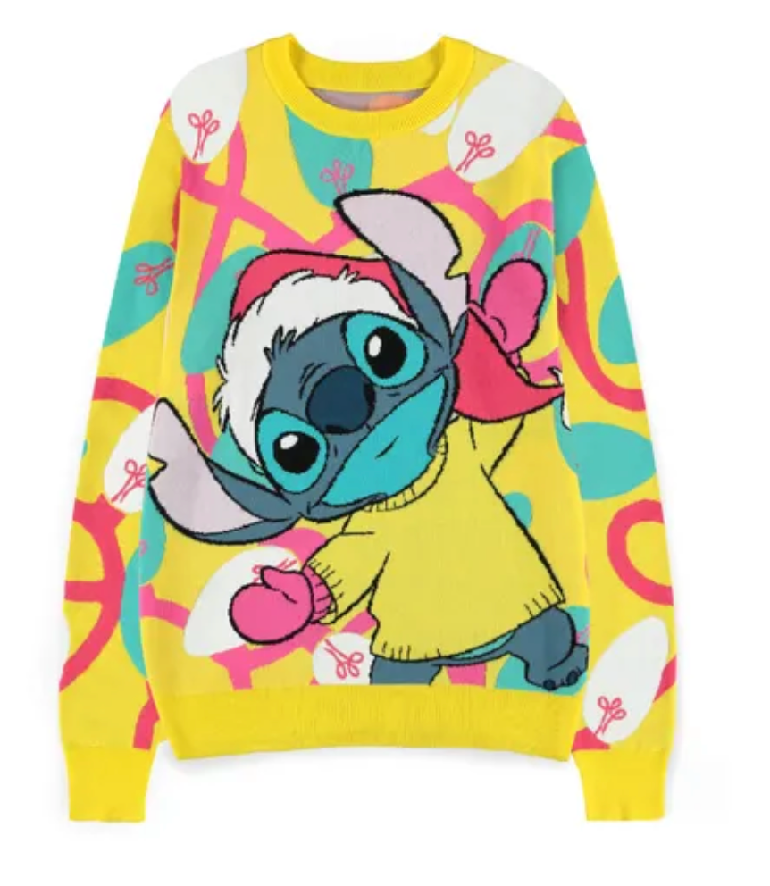 Need something “extra” for your next holiday party? Look no further! Nothing is as vibrant as this adorable Lilo & Stitch Christmas jumper! The colorful knit is not just eye-catching but warm and comfortable as well. The front features a large teddy fabric patch of Stitch’s face with an embroidery above that says, “Merry and bright.”