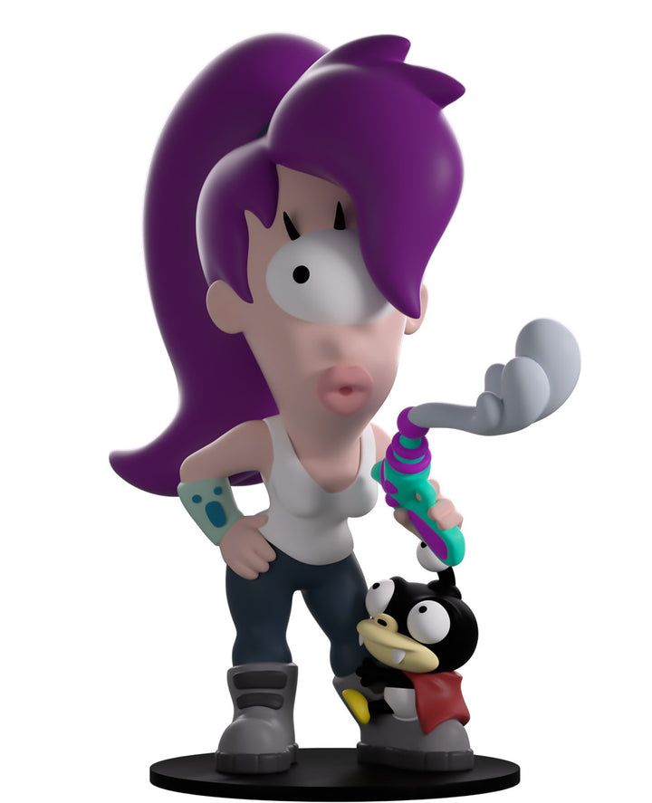Leela & Nibbler have steered the Planet Express into Youtooz for an urgent delivery, their vinyl debut! Blowing off the smoke from a recently fired ray gun and glancing to the side with her large singular eyeball, she stands at 4.5 inches tall with a thick purple fringe falling down her face as the rest is pulled back into a high ponytail. Dressed in a simple white singlet, tight blue pants and chunky grey boots, around her right arm is the ever useful LoJack-a-mater while gripped to her left leg is the adorable Nibbler who stares up lovingly with his three eyes, wearing a bright red cape and white diaper. The exterior of their packaging sees a vibrant set colorful of pop-art squares showcasing the cast of the show, while the interior is a repeating circle pattern of black and grey brain slugs as light impact lines streak their way over the black protective sleeve, perfectly showing off their figures through the large clear display window at its front. This collectible ships in a matte, embossed, protective outer sleeve and a custom-sized plastic protector for maximum protection during shipping.