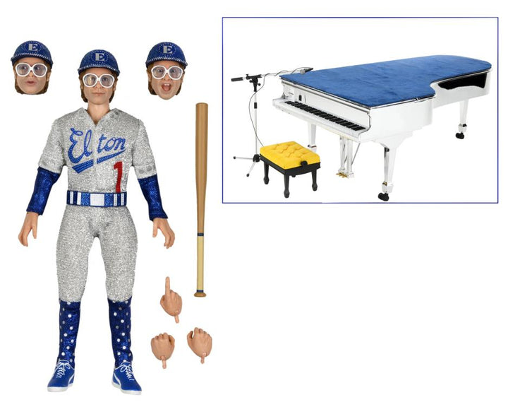 This deluxe set comes in window box packaging and includes Elton's baseball bat, piano bench, microphone stand, interchangeable hands, and three interchangeable heads with different expressions.
