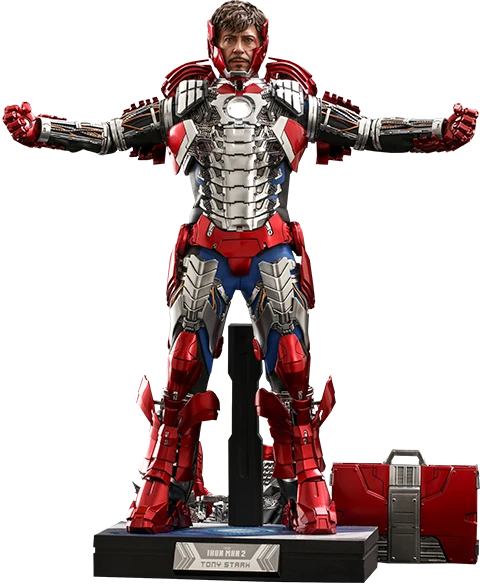 The movie-accurate figure is finely crafted based on Robert Downey Jr. as Tony Stark/Iron Man in the movie, features a newly developed Tony Stark head sculpt with specially applied battle-damaged effects; a gorgeously detailed racing suit; LED light-up function design on arc reactor, and forearms; attachable Iron Man Mark V armour parts in defined proportion including helmet, chest and shoulders, upper back, thigh and calf armours, hands with articulated fingers; skilfully painted in red and silver colouring with an astonishing metallic appearance; several pieces of interchangeable armours for different assembling looks; and a figure base.