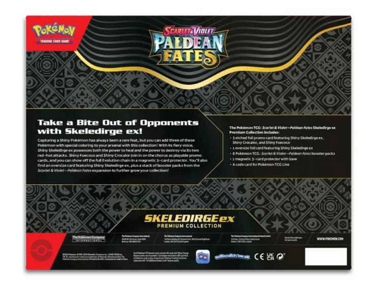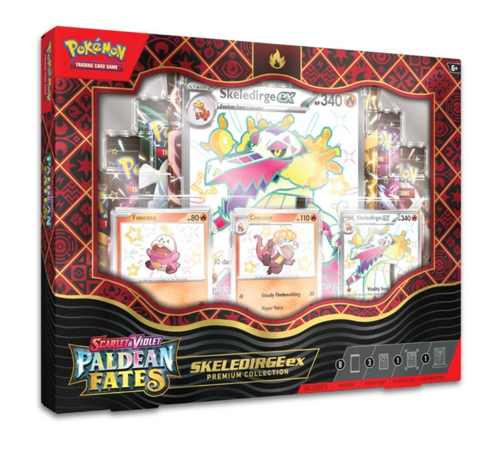 The Pokémon TCG: Scarlet & Violet—Paldean Fates Skeledirge ex Premium Collection includes: