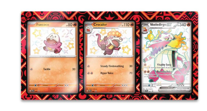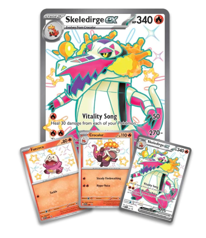 Capturing a Shiny Pokémon has always been a rare feat, but you can add three of these Pokémon with special coloring to your arsenal with this collection! With its fiery voice, Shiny Skeledirge ex possesses both the power to heal and the power to destroy via its two red-hot attacks. Shiny Fuecoco and Shiny Crocalor join in on the chorus as playable promo cards, and you can show off the full Evolution chain in a magnetic 3-card protector. You’ll also find an oversize card featuring Shiny Skeledirge ex, plus a stack of booster packs from the Scarlet & Violet—Paldean Fates expansion to further grow your collection!