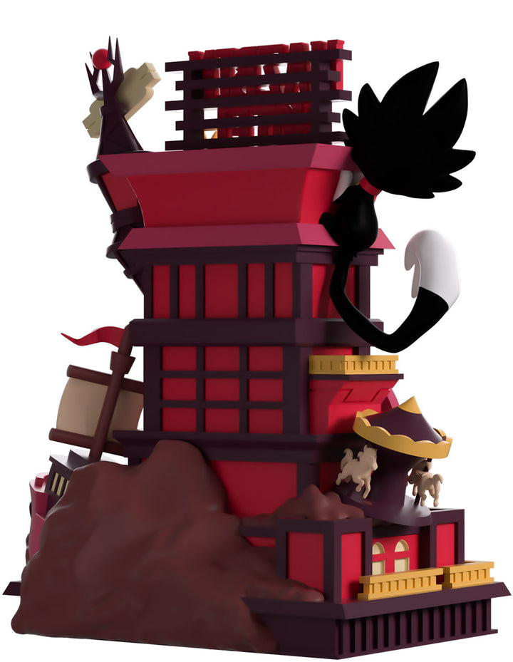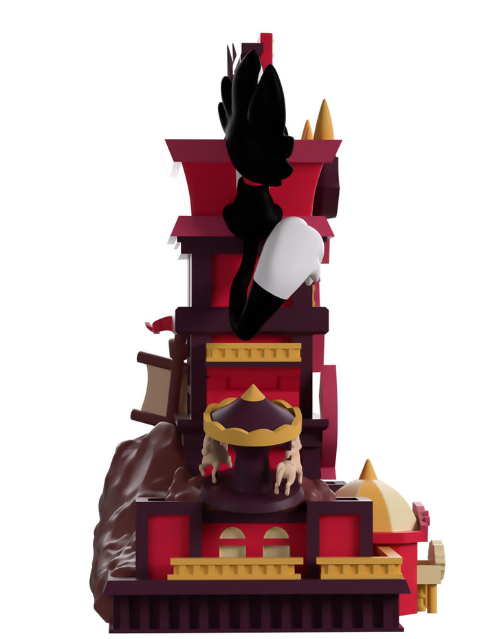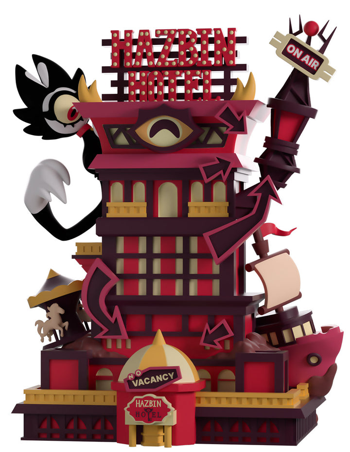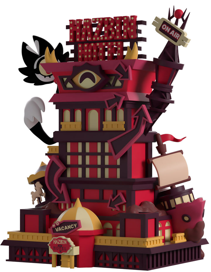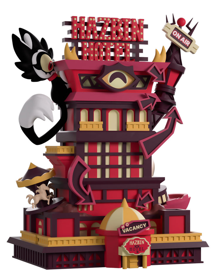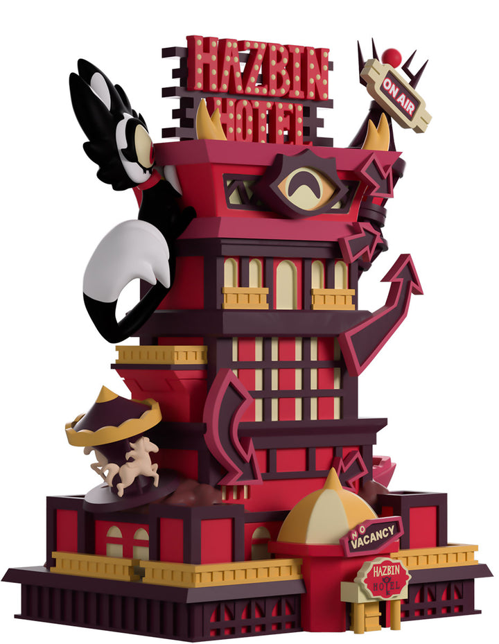 Here it is, in all its glory, the Hazbin Hotel! At a huge 7.4 inches tall with a large sign on its roof, as a curious KeeKee is propped on one side and a large spire stretches out from the other with an ‘On Air’ signal on the top, a large eye sits front and centre above the many floors and windows of the building. Covered in pointing arrows and with a ‘No Vacancy’ sign sitting haphazardly over the entrance, a large ship bursts out of the side of the hotel and is mirrored by an off-kilter carousel. This collectible ships in a lovingly designed package that sees the interior covered in an intricate red and grey pattern that mimics the hotel’s wallpaper which continues onto the exterior as the hotel sits underneath a giant pentagram in the sky.