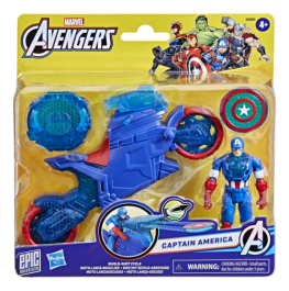 Kids can imagine racing into battle to blast the baddies with the Captain America Shield-Shot Cycle! This collectible Marvel Avengers action figure playset is a part of Hasbro’s exclusive Epic World of Action series and features a classic design & deco. This 4-inch-scale (10 cm) figure and vehicle set can't be missed and will make the perfect gift for kids or addition to any collection of Super Hero figures! Look for more Epic World of Action toys for boys and girls to collect, including figures, playsets, and vehicles! (Each sold separately. Subject to availability.) Copyright MARVEL. All trademarks and registered trademarks are the property of their respective owners. HASBRO and all related trademarks and logos are trademarks of Hasbro, Inc. Includes: Figure, toy motorcycle, projectile launcher, and projectile. Figure scale: 4 inches (10 cm) Ages 4 and up WARNING: Small parts may be generated. Not for children under 3 years. © 2025 MARVEL © 2025 Hasbro. All Rights Reserved