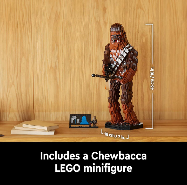 Mark the 40th anniversary of Star Wars: Return of the Jedi by creating a fitting tribute to a legendary Wookiee with this LEGO® Star Wars™ Chewbacca (75371) build-and-display figure. Channel your creative Force to recreate his hairy body in LEGO style and build his bandolier and giant bowcaster. This impressive buildable LEGO figure stands over 46 cm (18 in.) tall and has a built-in display stand. The set also includes a plaque with information about the character, plus a Chewbacca LEGO minifigure with a stud-shooting bowcaster.