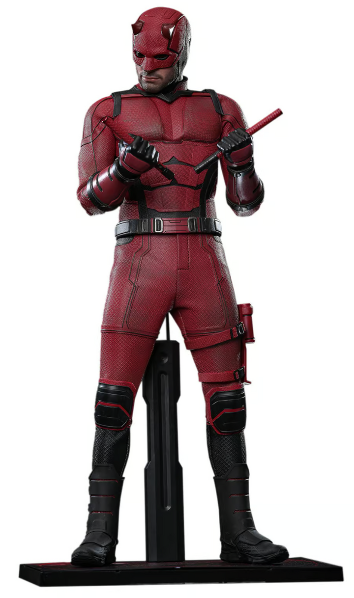 Inspired by Charlie Cox’s classic portrayal as Daredevil, the 1/6th scale figure, based on his look in Daredevil: Born Again, features a newly developed Matt Murdock head sculpt, a new cowled head with interchangeable lower faces, a finely tailored Daredevil suit with weathering details to replicate his suit after combats, his iconic Billy Clubs in different styles for alternative display options, a damaged Daredevil cowl with one horn broken, his accessory - THAT pair of sunglasses and a figure stand.
