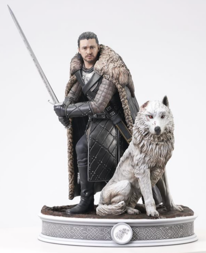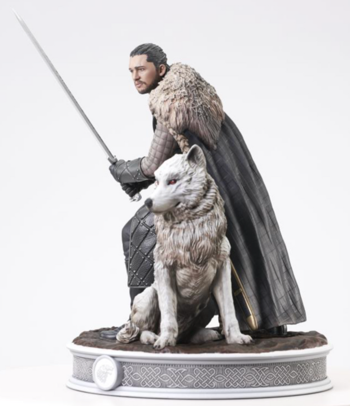 A Diamond Select Toys release! It's an all-new product line from Diamond Select Toys, based on the hit HBO series Game of Thrones! In this inaugural sculpture, Jon Snow crouches, sword at the ready, as his injured direwolf Ghost looks on. Both are in their Season 8 appearances, and this piece measures 10 inches to the tip of Jon's sword. It comes packaged in a full-color window box. Designed by Nelson X. Asencio, sculpted by Ed Trujillo.