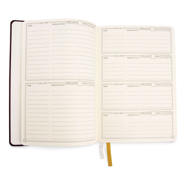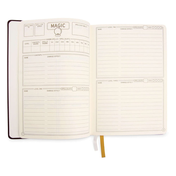 This notebook has everything you need and more. You'll find all kinds of different places to keep track of important things that you've never seen on any other dnd Character Sheet, like customizable character resources, coinage, magic item attunement trackers, session logs and much much more. Track everything neatly Next to all the standard stuff you expect from a Character Sheet this notebook also offers the ability to track Spells, spell slots, coinage, loot, customizable character resources, locations, components, magice potions and way more! Two Campaigns! Worried about your dnd character dying? Or do you just play more than one dnd campaign at the same time? No worries, we got you. This notebook features two full character sheets and has two differently colored bookmarks to keep track of both! Document Pouch Don't lose those loose sheets of paper we all tend to have sometimes, just stick them in the document pouch in the back!