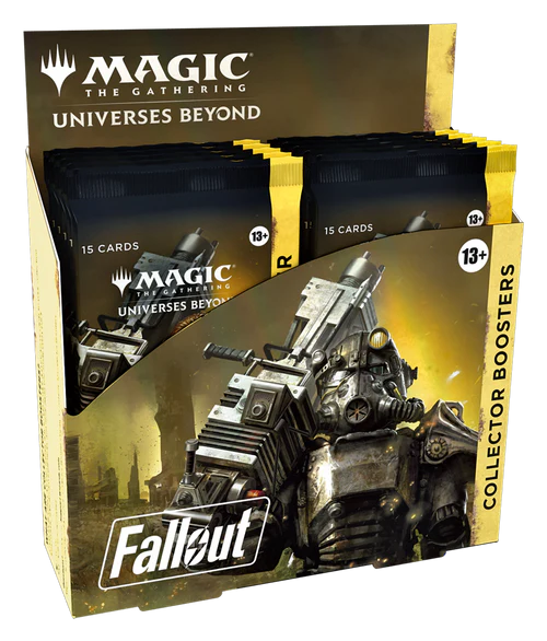 The vault is open! This booster is so overstuffed with perks for Fallout fans, it’ll test the limits of your carrying capacity. Expect to encounter Rares and/or Mythics, Traditional Foils, Extended-Art cards, and special Fallout-themed card treatments. Each Magic: The Gathering—Fallout Collector Booster contains 15 Magic: The Gathering cards and 1 Traditional Foil double-sided token, with a combination of 7–14 cards of rarity Rare or higher and up to 7 Uncommon, up to 5 Common, and 1 Land cards. Every pack contains a total of 12 cards with a shining foil treatment, including 3–10 Surge Foils and 2–9 Traditional Foils.