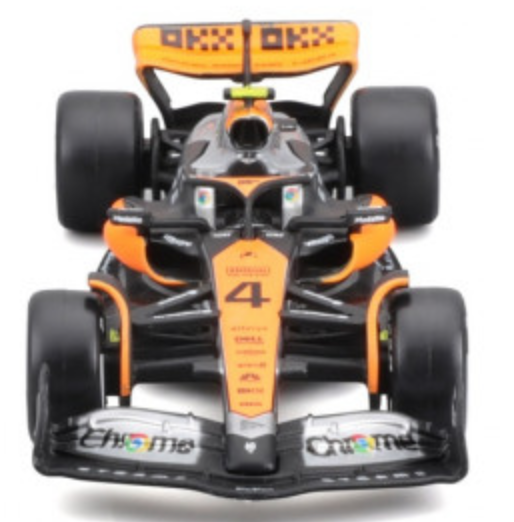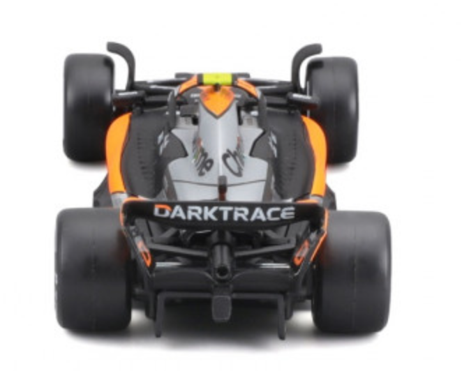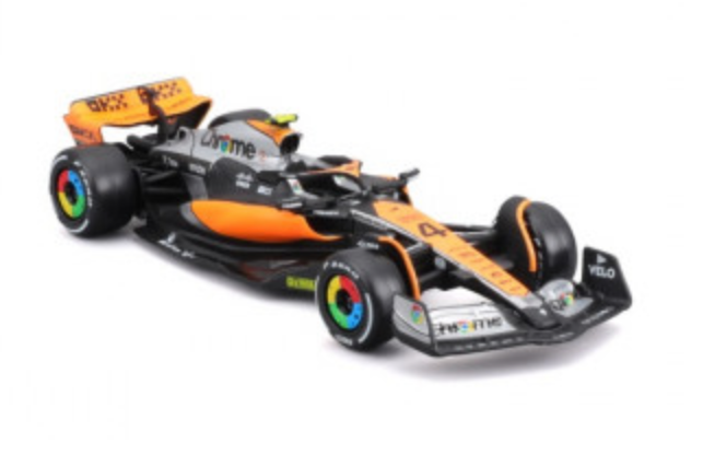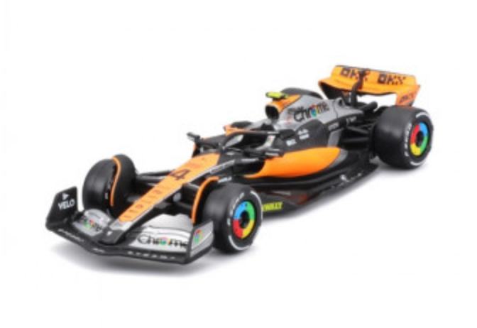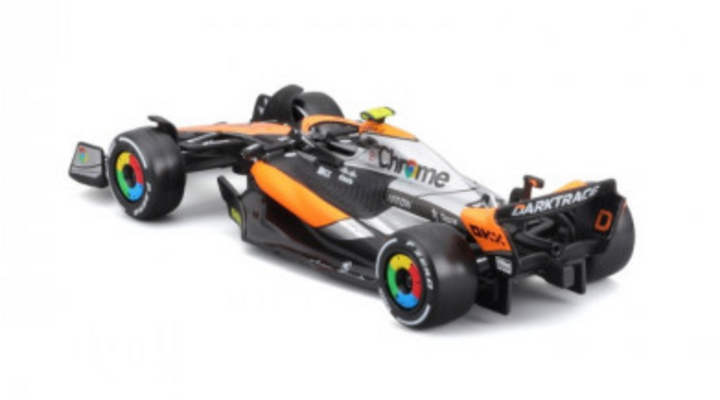 An intricately crafted replica of an F1 Mclaren Mcl60 2023 car as driven by Norris. This 1:43 scale diecast replica perfectly recreates the distinctive shape of the F1 car, capturing every aerodynamic curve and line as it can be seen on the real vehicle. The level of detail on the surface is incredible, with authentic sponsor and race decals perfectly recreated.