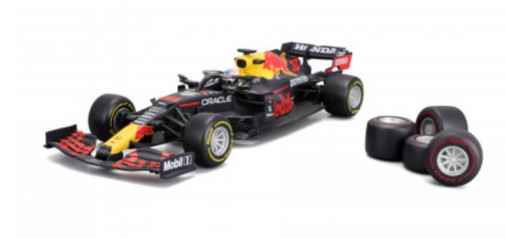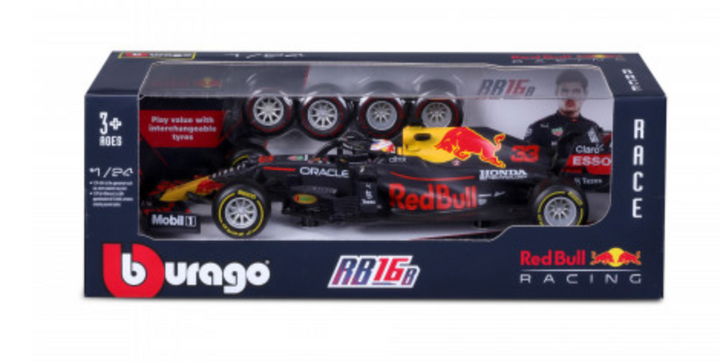 Highly detailed model of the RB18 car driven by Max Verstappen in 2021. This 1:24 scale diecast replica perfectly recreates the distinctive shape of the F1 car, capturing every aerodynamic curve and line as it can be seen on the real vehicle. The level of detail on the surface is incredible, with authentic sponsor and race decals perfectly recreated. Comes with interchangeable tyres that can be swapped like a real pit stop.
