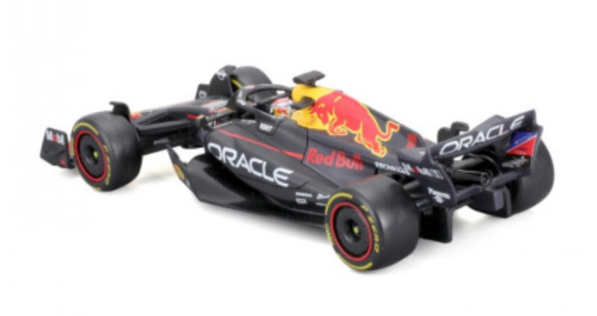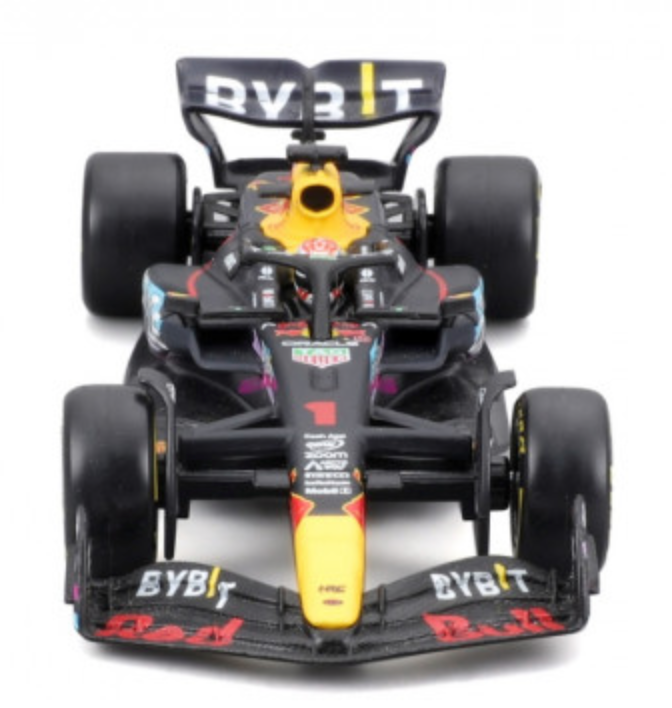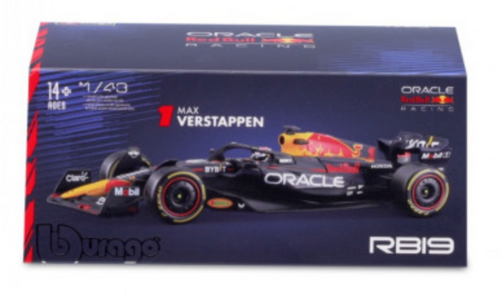 An intricately crafted replica of an F1 Red Bull Racing Rb19 2023 car as driven by Max Verstappen. This 1:43 scale diecast replica perfectly recreates the distinctive shape of the F1 car, capturing every aerodynamic curve and line as it can be seen on the real vehicle. The level of detail on the surface is incredible, with authentic sponsor and race decals perfectly recreated.