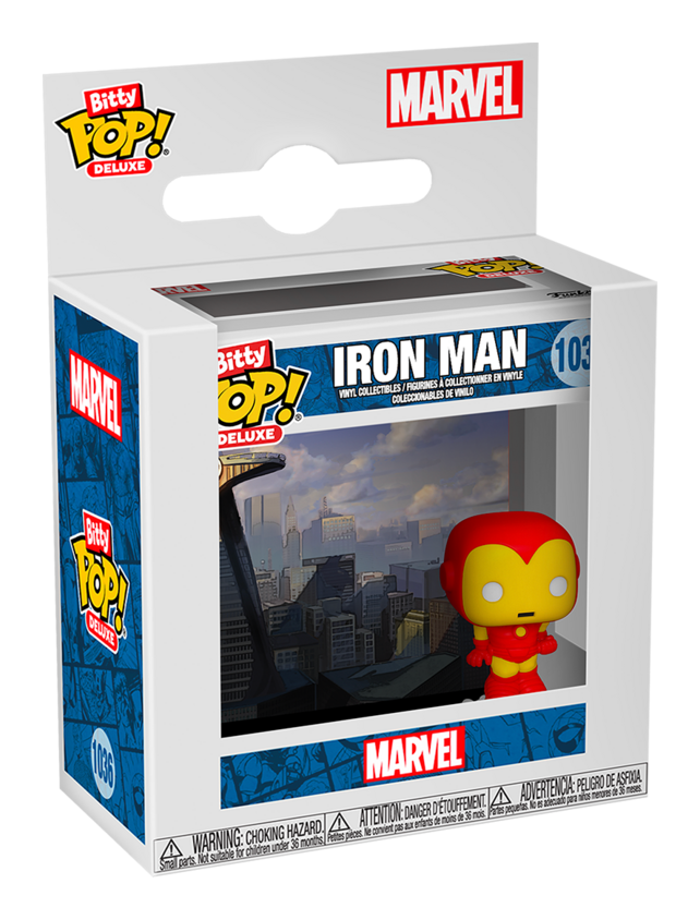 Expand your Marvel collection with this exclusive Deluxe Bitty Pop! Iron Man! Packaged in a hard acrylic display case, this Bitty Pop! Iron Man stands out against a matching backdrop of Stark Tower! The Bitty Pop! figure is adhered to an acrylic base that can be removed from the display case. The display case also includes an extra space for you to add another of your favorite Bitty Pop! characters to the scene! Mix and match for endless combinations! Vinyl figure is approximately 0.9-inches tall. Acrylic display case is approximately 2.5” W x 2.4” H x 1.25” D. One figure per single package purchase. Find more Funko products at Value Channel. Warning: Choking Hazard. Collectibles are small. Not for children under the age of 3 years old.
