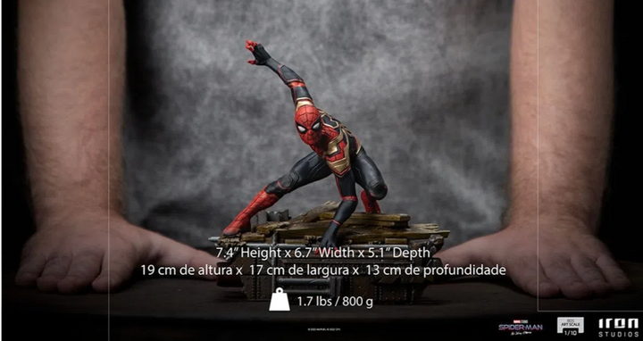 Although still a teenager, but already with great experience acting alongside the Avengers, the charismatic web-shooter-hero faces one of the darkest and most tragic moments of his life. To overcome his biggest challenge, facing villains from alternate worlds, he receives help from two older versions of himself, coming from these universes to help him rescue and heal the insanity of their enemies, and return with them to their respective original worlds. Using his refined and updated integrated/hybrid suit developed using Tony Stark’s technology, in the blue, red, and black colors with golden details, the youngest Peter Parker, original from this world in the MCU universe, nicknamed among his alternate older “brothers” as Peter-One, gets ready to jump for action on a pedestal formed of wood and metallic structures from a scaffold on the Liberty Island in New York, Iron Studios present the Spider-Man Peter #1 statue, inspired by the movie on which the young actor completes his trilogy of movies in the role of this iconic hero from Marvel, part of Phase Four in the MCU.