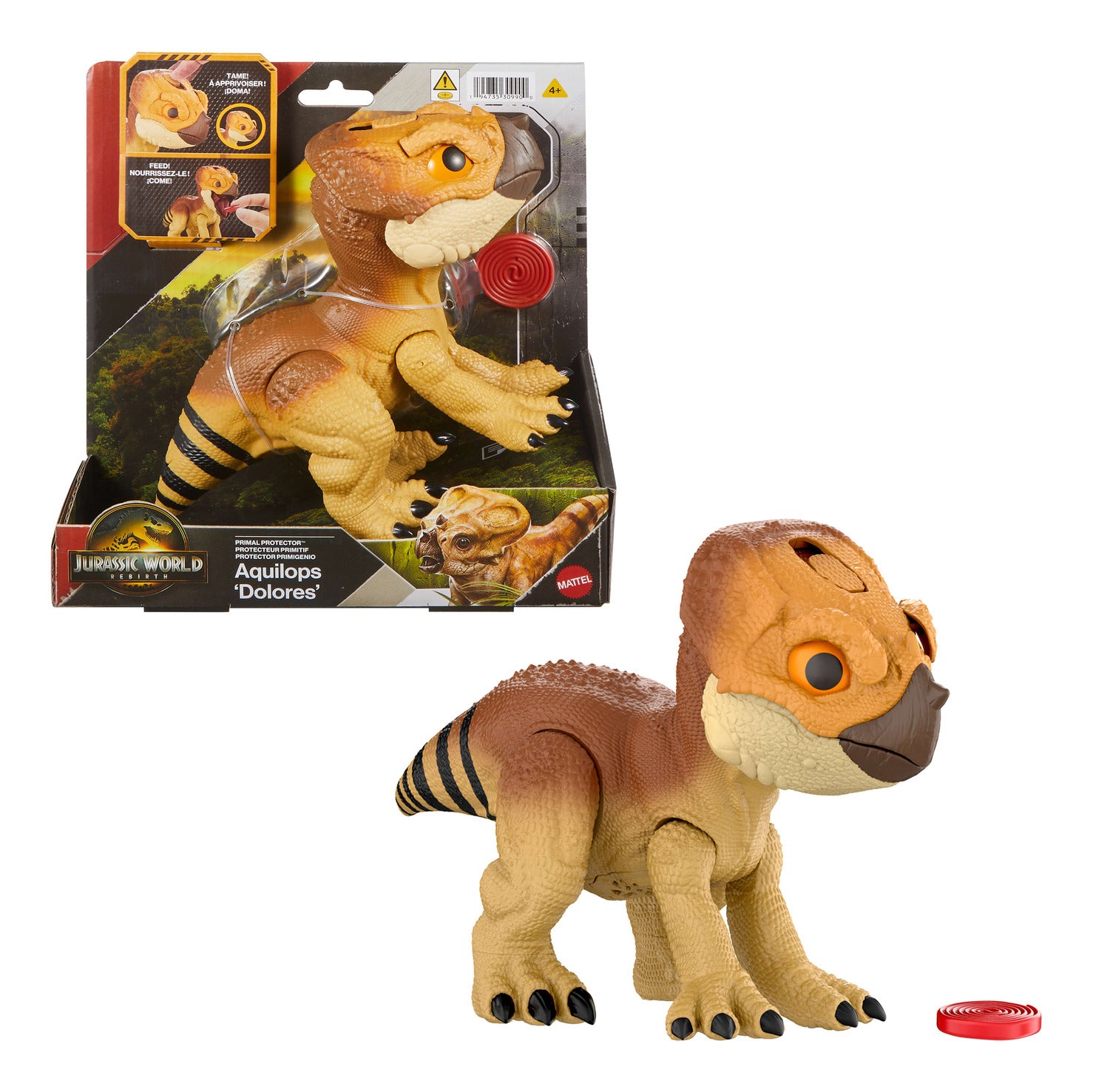 Bring the human and dinosaur interactions from Jurassic World Rebirth home with this Primal Protector Aquilops inspired by the relationship between Isabella and her companion dinosaur, 'Dolores' in the movie. This interactive dinosaur toy reacts positively to petting, has a tail activated 'protect' action mode and is ready to chomp on a licorice treat. This active playmate with design inspired by the movie makes a great gift for dinosaur lovers 4 years and older. Color and decorations may vary. WARNING: Not suitable for children under 36 months. Small parts may be generated.|WARNING: This product contains a Button or Coin Cell Battery. A swallowed Button or Coin Cell Battery can cause internal chemical burns in as little as two hours and lead to death. Dispose of used batteries immediately. Keep new and used batteries away from children. If you think batteries might have been swallowed or placed inside any part of the body, seek immediate medical attention.
