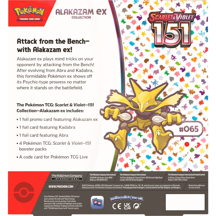 Includes four Scarlet & Violet—151 booster packs, one double rare card featuring Alakazam ex and two foil promo cards featuring Kadabra and Abra