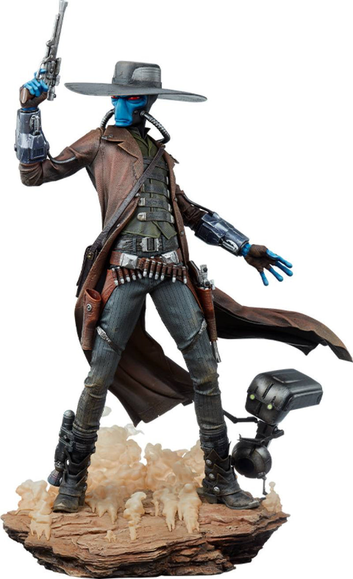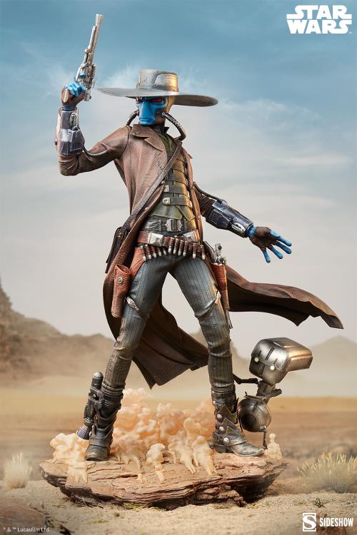 Measuring 22.6” tall, 13.4” wide, and 12.5” deep, the Cad Bane™: A Few Bounties More Premium Format™ Figure is ready to track his target to the end of the galaxy. After chasing his hard-earned credits through a sandstorm, Cad Bane finally comes to a standoff. His duster coat billows behind him, but the blue-skinned bounty hunter’s red eyes are fixed firmly ahead … and shaded from the blistering desert sun by his iconic wide-brimmed hat. His service droid Todo 360 watches nervously from behind Cad Bane’s leg, awaiting orders from atop the scorching sand dunes.