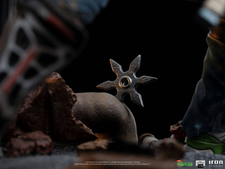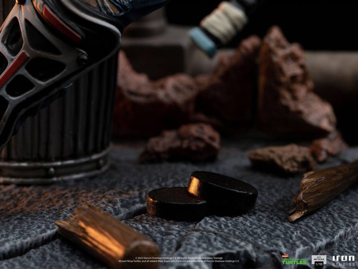Over a pedestal of a diorama set reflecting his territory, with old rusty pipes, broken bricks and a trash can with launched shuriken stars from his ninja rivals of the Foot Clan, Iron Studios present the statue “Casey Jones BDS - TMNT - Art Scale 1/10”, with the anti-hero holding his club with the name “Eastman” printed as a brand, a tribute from Iron Studios to his creator on the comics.