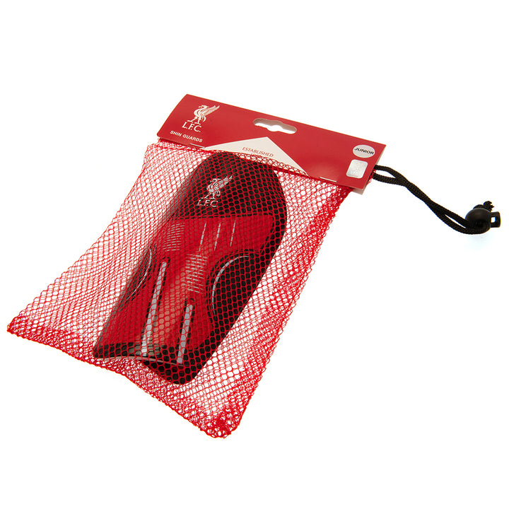 Red and black delta design slip in shin guards featuring the Liverpool crest